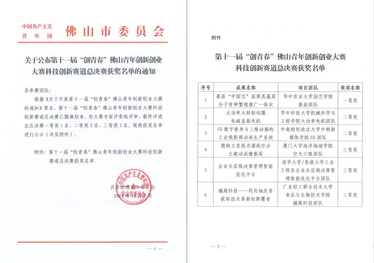 日前,由共青团佛山市委员会主办、广东高校科技成果转化中心承办的第十一届“创青春”佛山青年创新创业大赛科技创新赛道总决赛圆满举行。由李静教授、邓毛程教授、刘禹杉老师指导的生化231杨晨、生化231汪婷、生化231李文俊,生化222郭沛鑫、生化221陈涵淳团队的橘源科技项目荣获三等奖。